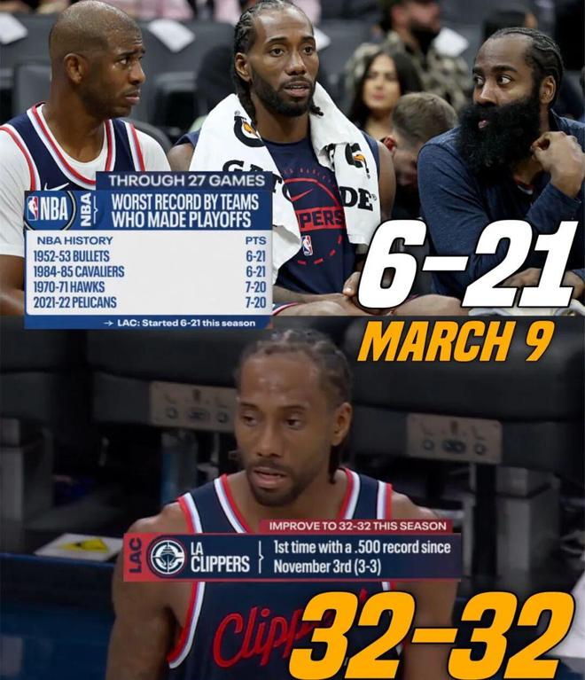 至于快船,同样因为前期挖坑太大,目前32胜32负只能排在西部第八,且距离西部第七的太阳(37胜27负)差了5个胜场、距离第六的掘金(39胜26负)差了6.5个胜场。